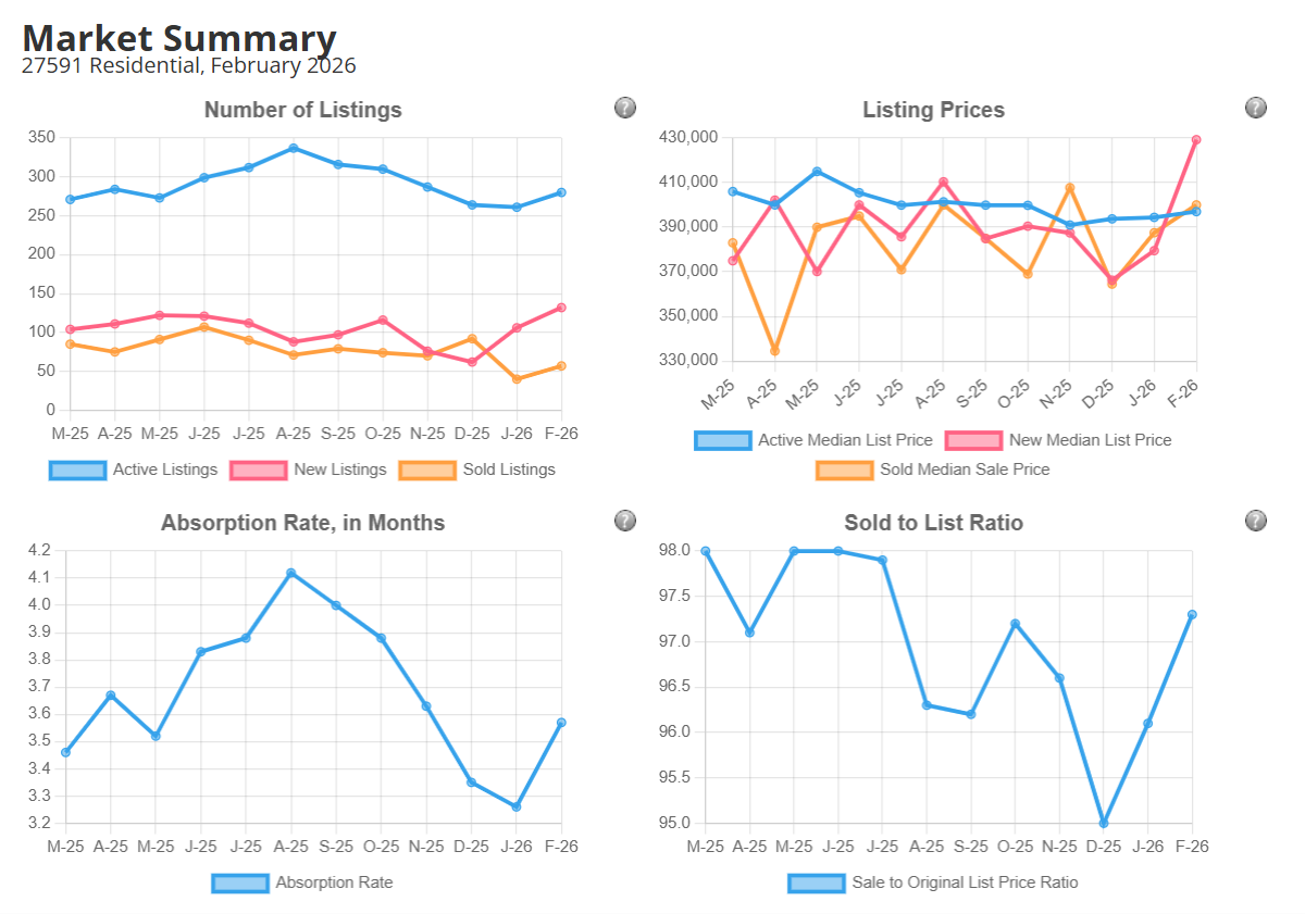 If you're buying or selling a home in Wendell this year, understanding what the market is actually doing — not just what the headlines say — is the difference between a smart decision and an expensive one. The four charts below track Wendell's market across the metrics that matter most over the past 12 months. Here's what they show and what it means for you.